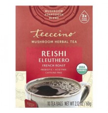 Teeccino, Mushroom Herbal Tea, Reishi Eleuthero, French Roast, Caffeine Free, 10 Tea Bags, 2.12 oz (60 g)